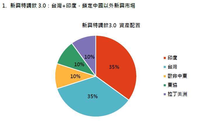 在全球資金重新尋找「成長接棒者」的此刻,新興市場正成為另一個兼具成長與分散效果的投資焦點。當成熟市場評價偏高、成長動能趨於分歧之際,人口紅利、產業升級與內需擴張,正讓「中國以外的新興市場」成為下一段中長期布局的核心舞台。「新興特調飲」(詳細請參閱《新興特調飲,一杯品味未來的新興市場良機》)正是為看好這條趨勢主線而誕生的投資組合。本組合聚焦三大最具結構性優勢的區域:台灣 35%,AI 與半導體持續擔任全球科技供應鏈關鍵引擎;印度 35%,年輕且龐大的勞動力人口,支撐長期內需與製造轉型;其他不含中國的新興市場 30%(如東協、歐非中東等),分散單一市場風險,同時掌握多元成長動能。基於對相關區域基本面與中長期成長趨勢的判斷維持不變,本季投組未進行調整。
