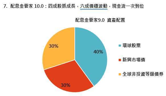 「配息金管家」以股四債六作為資產配置骨架,一種偏向保守、追求穩定收益的平衡型配置,核心目標是運用股票的成長潛力與債券的避險特性來降低整體波動,並在低波動的前提下創造報酬。股票部位採全球配置,分散單一國家與產業風險,聚焦具長期競爭力的企業與產業趨勢,作為投組的成長引擎。債券部位則採一半積極、一半穩健的雙層設計,以非投資等級債提高整體收益水位,同時搭配較高評級的投資等級債作為防禦緩衝,降低波動並提升抗震性。本季將全球投資等級債券基金調整為表現更亮眼的標的,以強化整體配置的穩健度與抗震力。