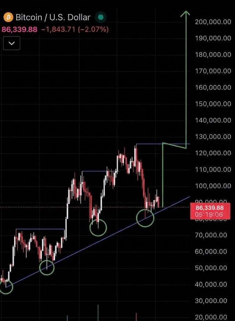 綜合分析這張比特幣兌美元的技術圖表,當前 87,284 美元的價格處於一個決定性的時刻,長期藍色上升趨勢線與階梯式支撐結構共同構築了強大的防線,綠色圓圈標示的歷史買點證明了該趨勢線的可靠性,而右側的綠色投射線則描繪了若趨勢延續所能達到的宏大願景,指向 200,000 美元的潛在空間,技術面上,只要價格不有效跌破這條關鍵趨勢線,整體的多頭趨勢依然完整,當前的回調應被視為上升趨勢中的蓄勢階段,而非趨勢反轉的開始,投資者應密切關注價格在此區域的反應,等待確認信號的出現。