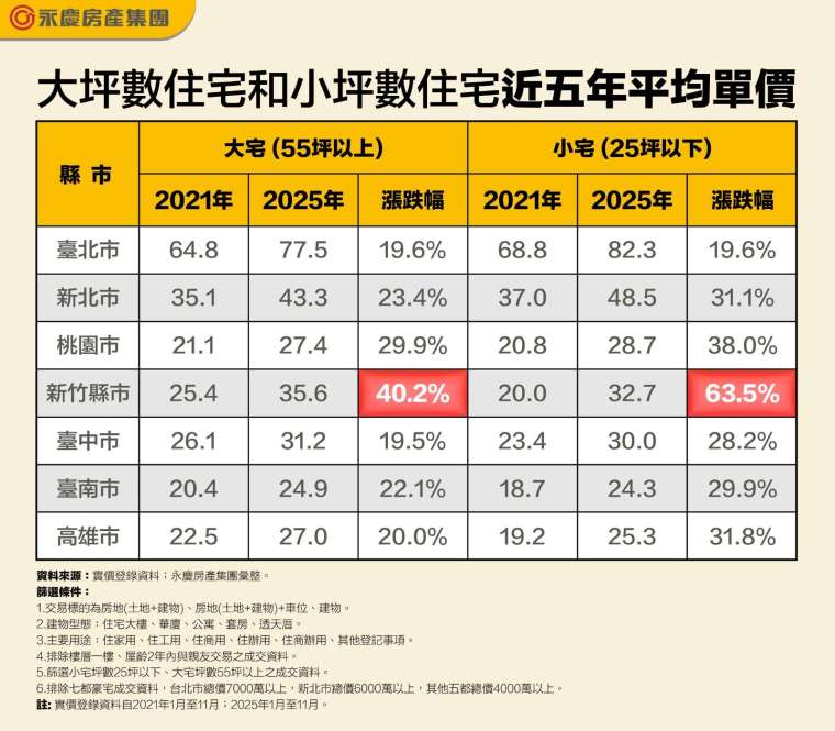 觀察 2021- 2025 年 5 年間,全台七都小宅房價漲幅已全面高於大宅。永慶房屋研展中心副理陳金萍指出,隨著近年人口結構轉變,小家庭增加,加上近幾年房價受惠於經濟穩定成長、資金管制寬鬆而迅速攀升,而高房價也讓民眾感受到沉重的購屋壓力,因此在預算與需求的考量下,小坪數住宅已逐漸成為購屋趨勢,也帶動單價的明顯高漲。