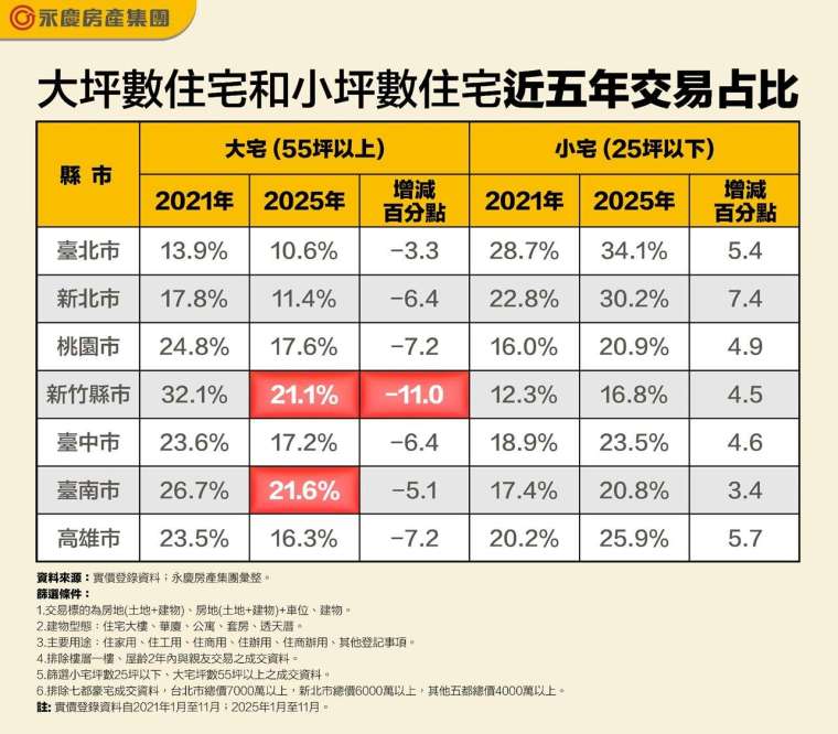 其中,新竹縣市雖然大宅交易占比減少幅度最大,5 年下滑 11 個百分點,但仍以 21.1% 居七都之首。陳金萍表示,新竹縣市大宅交易主要集中於科學園區所在的行政區,區內高所得家庭比例高,購屋預算相對充裕,對居住空間的需求也明顯高於其他都會區,使大坪數住宅仍有一定需求支撐。不過,隨著近年房價攀升,加上家庭結構逐漸轉向小家庭型態,大宅交易量也出現明顯下滑。