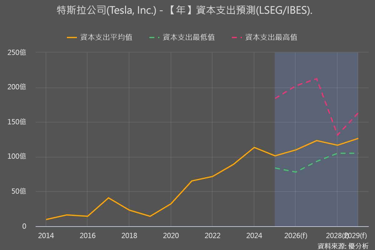 2026年01月29日(優分析/產業數據中心報導)⸺ 特斯拉Tesla(TSLA-US)計畫在 2026 年大幅提高資本支出,金額將較前一年倍增以上,創下歷史新高,規模超過 200 億美元,比市場平均預期的100億美元高出一倍,更值得注意的是,這筆龐大投資的絕大多數,並非用於傳統的「人類駕駛電動車」銷售業務,而是轉向全自動駕駛車輛與人形機器人等仍處於早期、尚未完全驗證的全新業務方向。