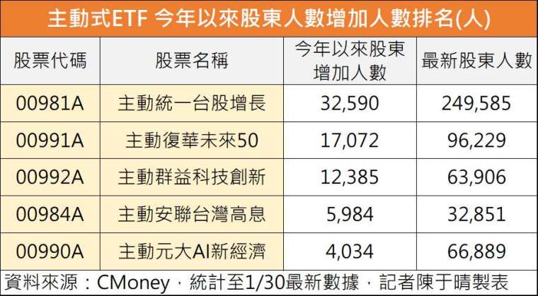 根據 CMoney 統計今年以來主動式 ETF 股東人數表現,增加人數前五名分別主動統一台股增長 (00981A-TW)、主動復華未來 50(00991A-TW)、主動群益科技創新 (00992A-TW)、主動安聯台灣高息 (00984A-TW) 及主動元大 AI 新經濟 (00990A-TW)。其中 00981A 不僅是今年人數增加最多的主動式 ETF,更穩坐所有主動式 ETF 的人氣王寶座,股東人數高達 24.9 萬人。
