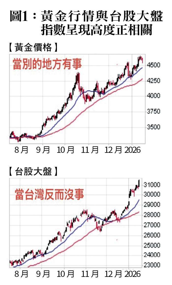 我們可以觀察金融市場的反應。當別的地方有事的時候,我們可以理解為地緣政治風險上升,於是市場避險情緒上升,有助於推高黃金的行情;同時,台灣反而沒事,意思是台灣所面對的地緣政治風險反而有所緩和,這會表現在台股大盤的走高。﹝圖 1﹞正好呈現這一點,就是黃金的行情與台股大盤指數果然出現統計上的高度正相關。