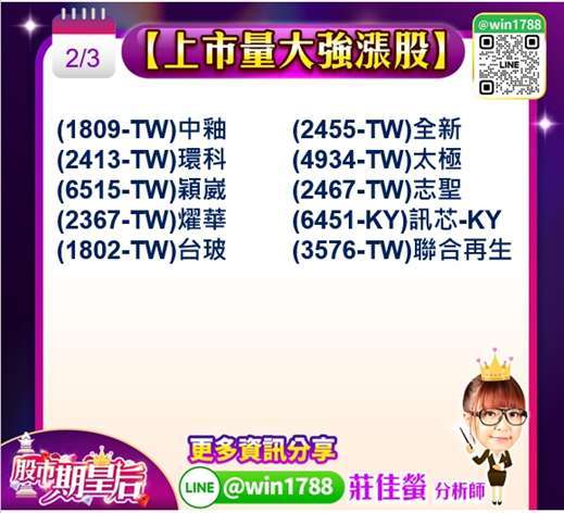 政策題材則點燃太陽能族群攻勢,(3576-TW) 聯合再生,(6244-TW) 茂迪,(4934-TW) 太極,齊步亮燈漲停,市場解讀政府對再生能源與綠電政策支持力道不減,加上產業庫存逐步去化,有助族群評價回升。