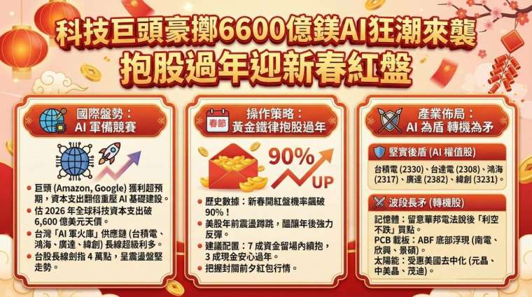 抱股過年首選,當然是獲利能見度最高的 AI 權值股台積電(2330)、台達電(2308)、台光電(2383)、鴻海(2317)、廣達(2382)、緯創(3231,這些是台股的中流砥柱,抱著過年絕對安心。 至於波段操作與年後轉機股,鎖定「記憶體、PCB、太陽能」三大族群: