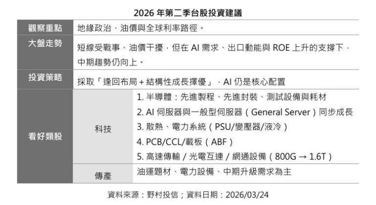 整體而言,姚郁如表示,第二季台股將在外部風險與基本面之間拉鋸,走勢以「震盪中趨勢向上」格局為主短線面對地緣政治與油價帶來的波動壓力,投資人宜以產業分化與公司基本面為核心,逢回建立或加碼長期勝率較高的結構性資產,並保留適度緩衝以應對突發事件。野村台股團隊將持續追蹤戰事演變、油價與運價、材料與封裝產能、以及全球利率路徑變化,動態調整佈局節奏,力求在不確定行情中守住風險、也不錯過成長。