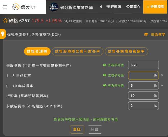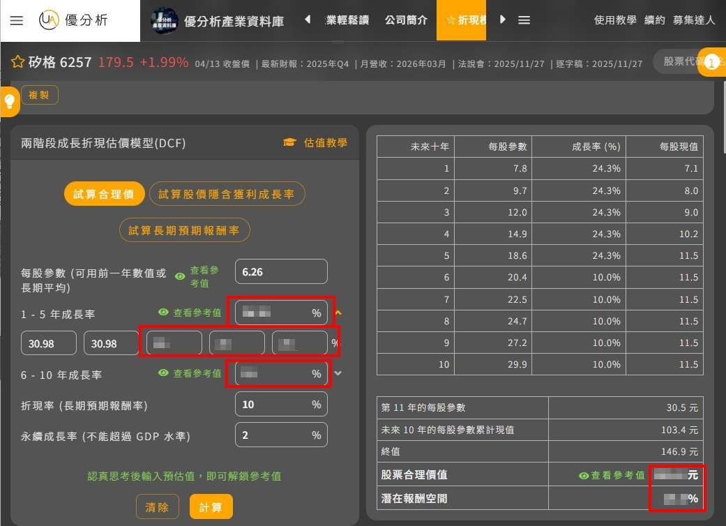 因為法人只有估兩年(2025-2026-2027),所以後面三年要自己思考可以怎麼填,可以用產業成長率,如果公司有提供未來幾年的展望會成長多少%,同業的展望成長率大約多少%也可以參考著填看看,或是完全都沒概念那就填長期通膨率2%看看;6-10年那格也是相同的道理,之後右下角就會出現算出來的合理價。