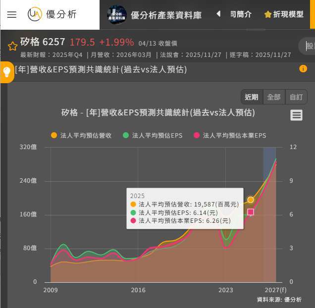 我們先來看看法人怎樣看矽格,折現模型的頁面往下滑可以看到法人預估的營收(黃線)、EPS(綠線)、本業EPS(紅線)數值。