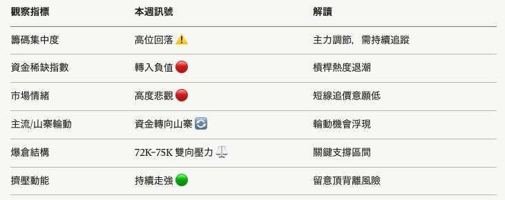 下週核心關注:籌碼集中度能否止跌回穩、資金費率是否重新翻正、72,000 美元支撐是否有效,三項條件若同步改善,行情仍有機會重啟上行;若持續惡化,則需防範震盪洗盤進一步擴大。